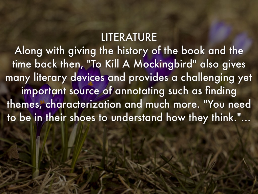 LITERATURE Along with giving the history of the book and the time back then, "To Kill A Mockingbird" also gives many literary devices and provides a challenging yet important source of annotating such as finding themes, characterization and much more. "You need to be in their shoes to understand how they think."