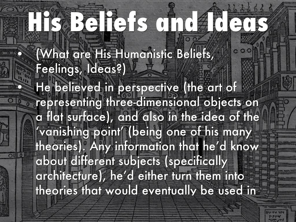 He believed in perspective (the art of representing three-dimensional objects on a flat surface), and also in the idea of the ‘vanishing point’ (being one of his many theories). Any information that he’d know about different subjects (specifically architecture), he’d either turn them into theories that would eventually be used in his work, or share that knowledge with the rest of the world (or at least as far as it could spread out to at the time). Doing this specifically made him a ‘humanist’, because of how his work that he shared impacted architects everywhere.