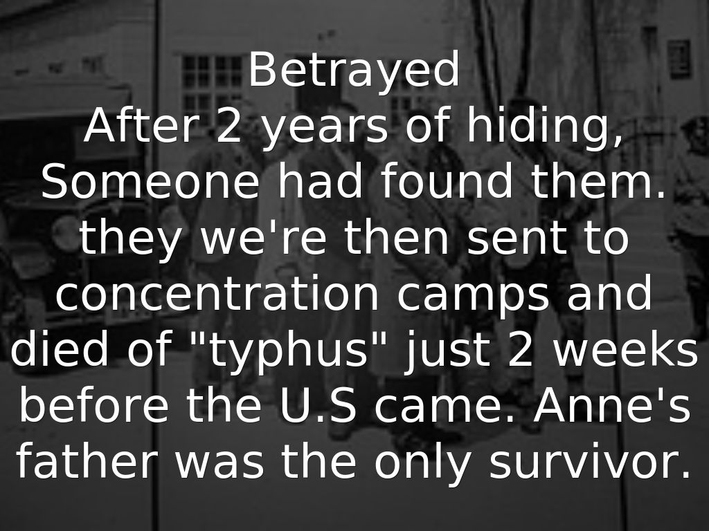 After 2 years of hiding, Someone had found them. they we're then sent to concentration camps and died of "typhus" just 2 weeks before the U.S came. Anne's father was the only survivor.