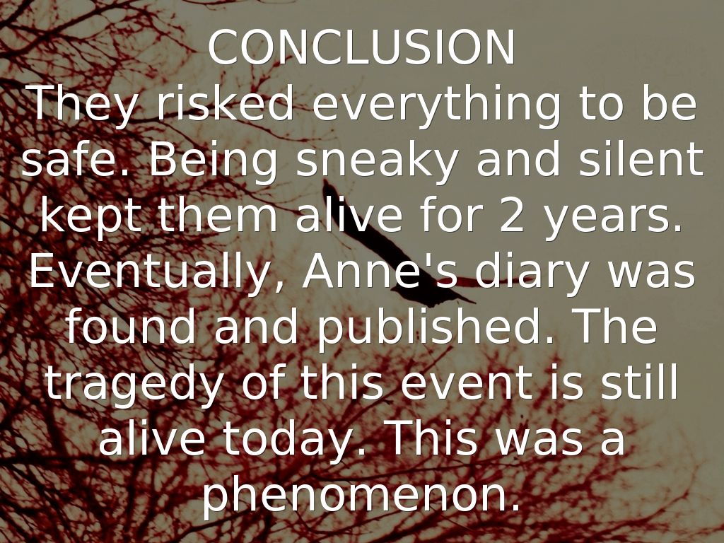 They risked everything to be safe. Being sneaky and silent kept them alive for 2 years. Eventually, Anne's diary was found and published. The tragedy of this event is still alive today. This was a phenomenon.