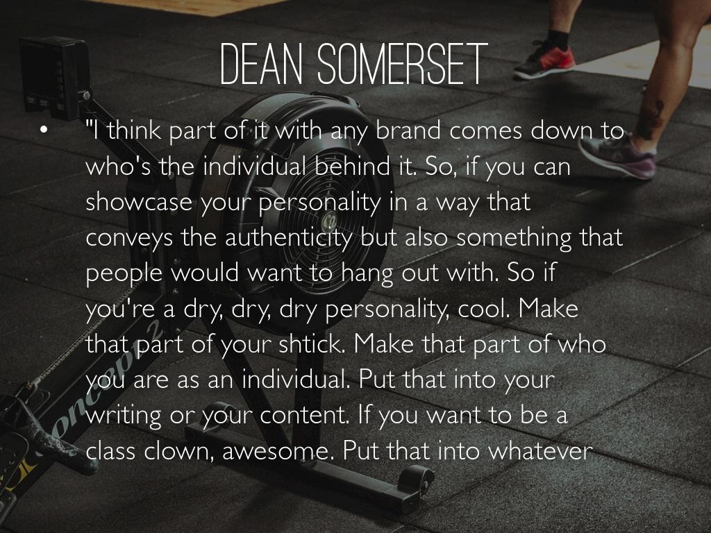 - "I think part of it with any brand comes down to who's the individual behind it. So, if you can showcase your personality in a way that conveys the authenticity but also something that people would want to hang out with. So if you're a dry, dry, dry personality, cool. Make that part of your shtick. Make that part of who you are as an individual. Put that into your writing or your content. If you want to be a class clown, awesome. Put that into whatever personality you're trying to put out there. But people want to hang out with people that they would want to hang out with, and whether they want to buy a training program or keep coming back to the website or doing whatever, make it something where people actually enjoy the process versus reading stereo instructions."