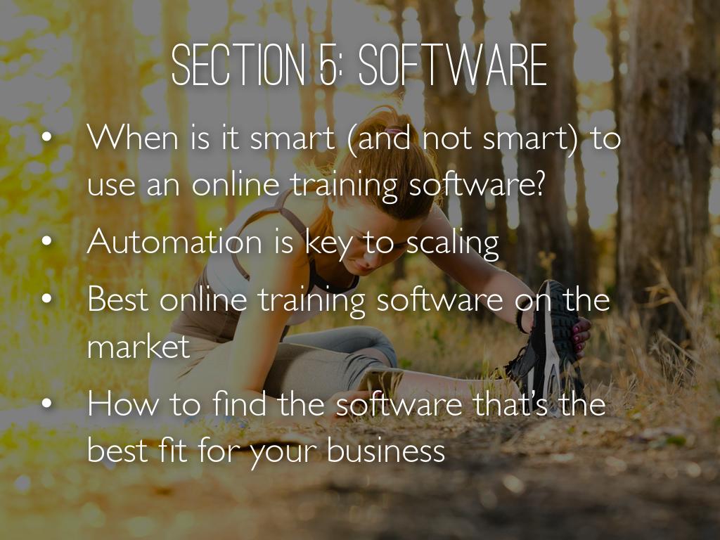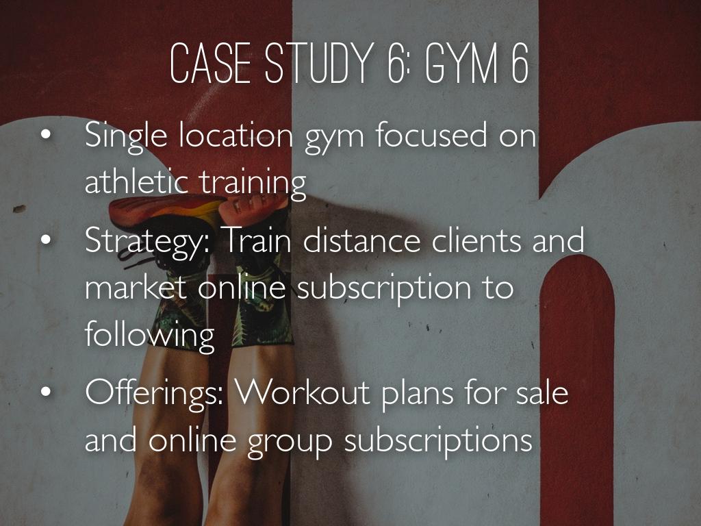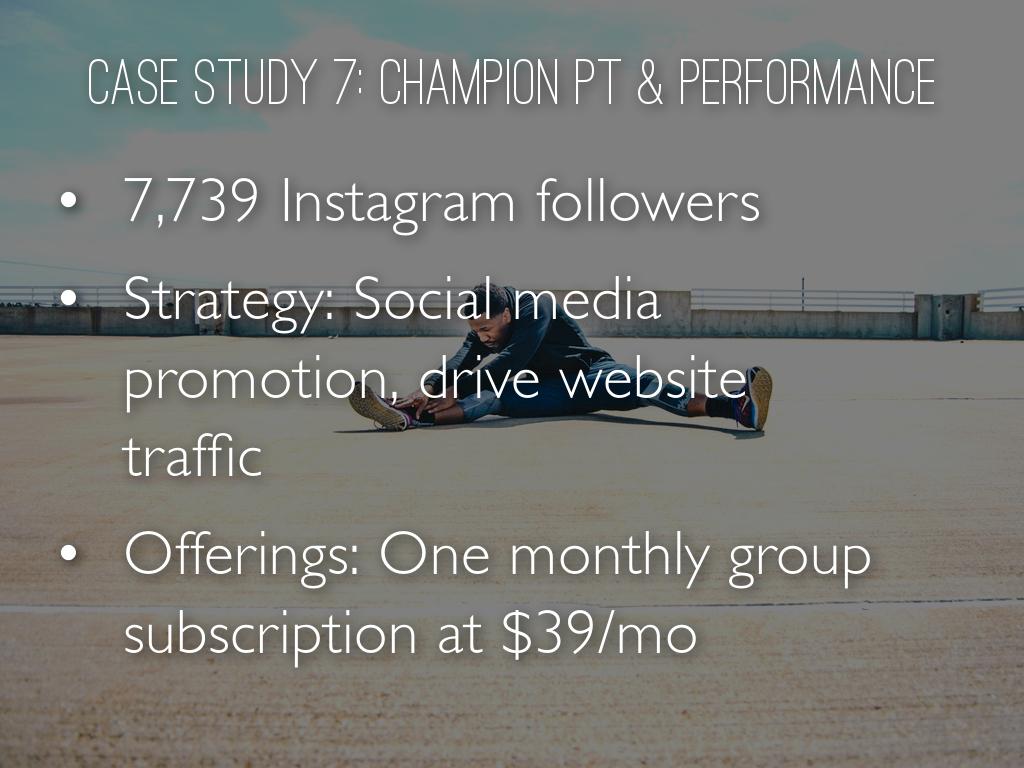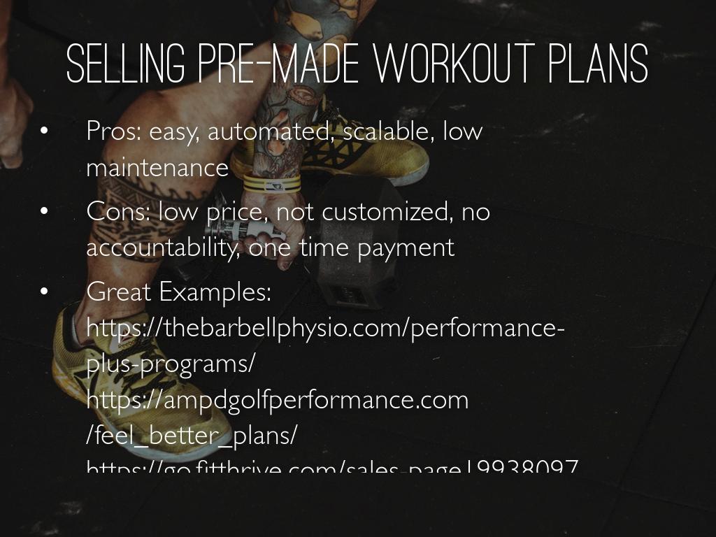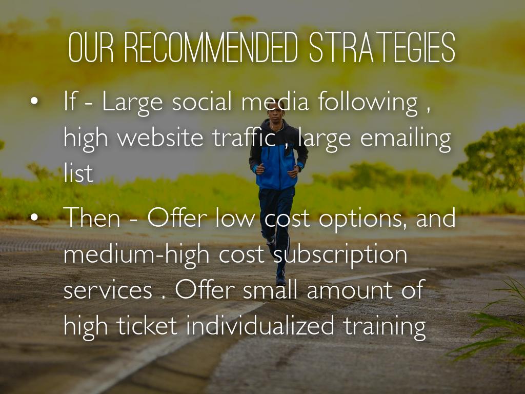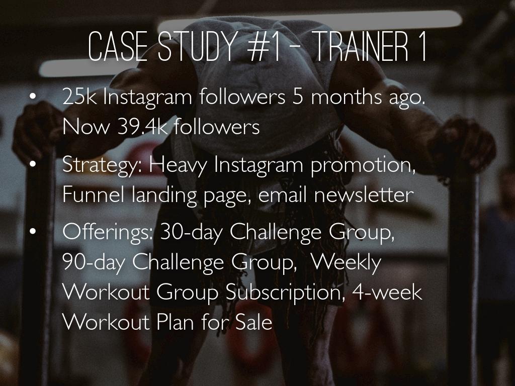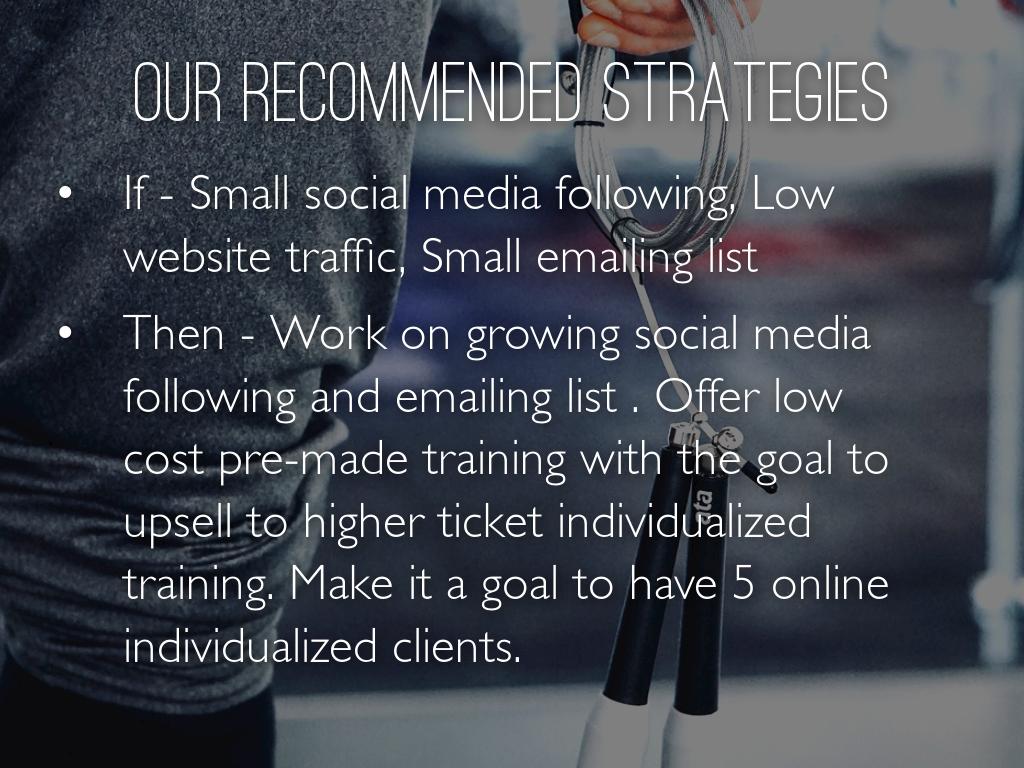 - Then - Work on growing social media following and emailing list . Offer low cost pre-made training with the goal to upsell to higher ticket individualized training. Make it a goal to have 5 online individualized clients.