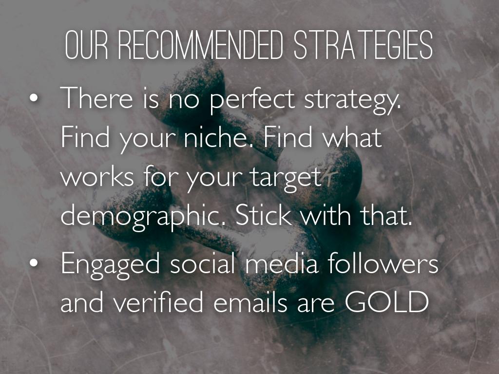 - There is no perfect strategy. Find your niche. Find what works for your target demographic. Stick with that.
