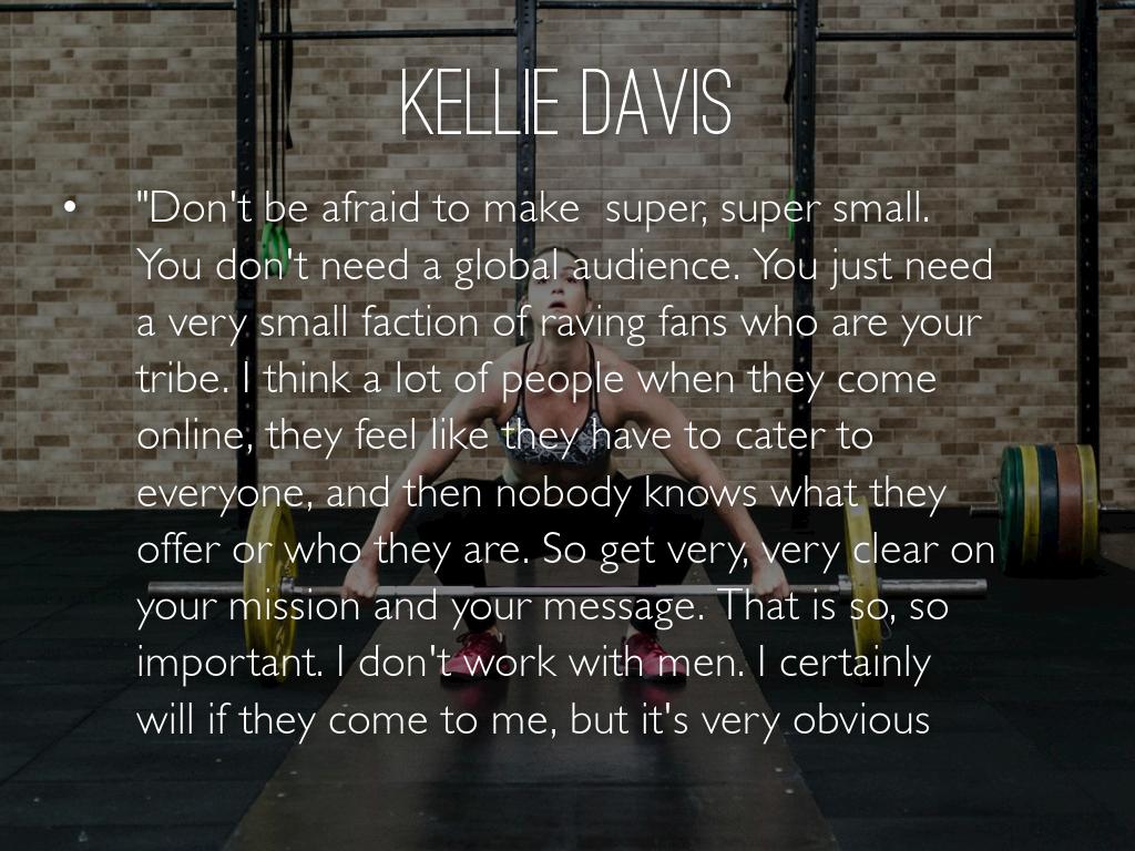 - "Don't be afraid to make your niche super, super small. You don't need a global audience. You just need a very small faction of raving fans who are your tribe. I think a lot of people when they come online, they feel like they have to cater to everyone, and then nobody knows what they offer or who they are. So get very, very clear on your mission and your message. That is so, so important. I don't work with men. I certainly will if they come to me, but it's very obvious that my tribe is women of a certain age, of a certain income level, and you know, on a certain path in their life."