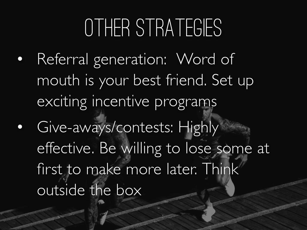 - Referral generation: Word of mouth is your best friend. Set up exciting incentive programs