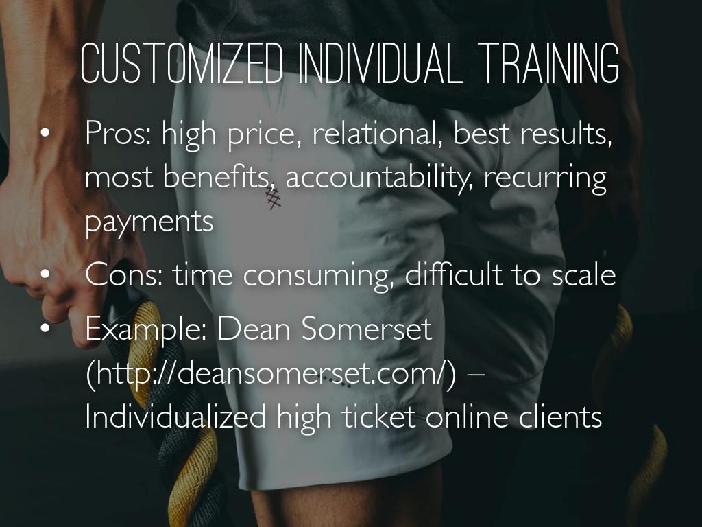 - Pros: high price, relational, best results, most benefits, accountability, recurring payments