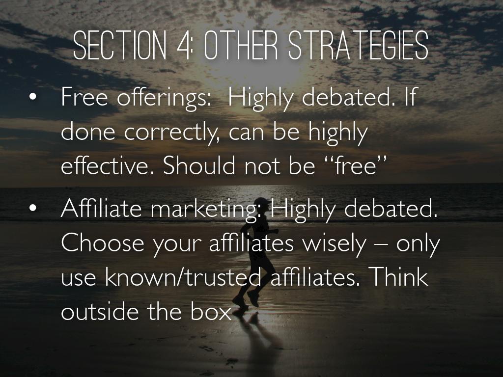 - Affiliate marketing: Highly debated. Choose your affiliates wisely – only use known/trusted affiliates. Think outside the box