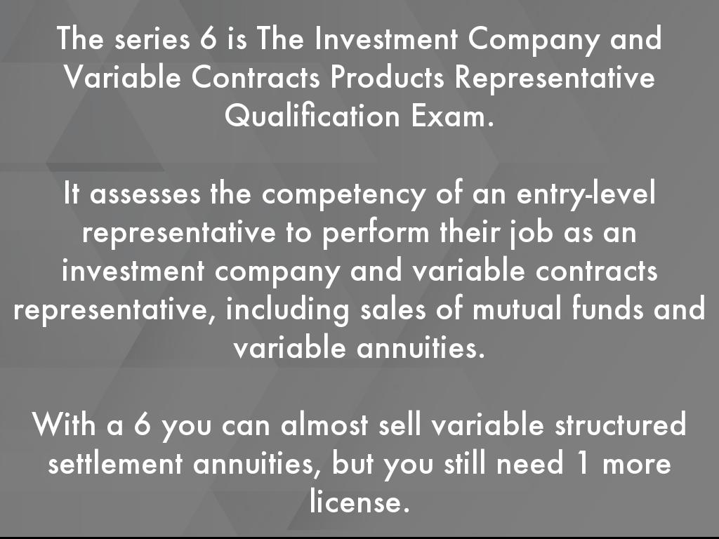 The series 6 is The Investment Company and Variable Contracts Products Representative Qualification Exam.