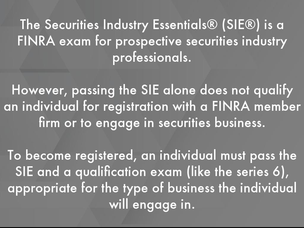 However, passing the SIE alone does not qualify an individual for registration with a FINRA member firm or to engage in securities business.