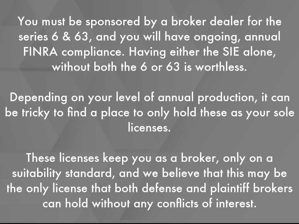 These licenses keep you as a broker, only on a suitability standard, and we believe that this may be the only license that both defense and plaintiff brokers can hold without any conflicts of interest.