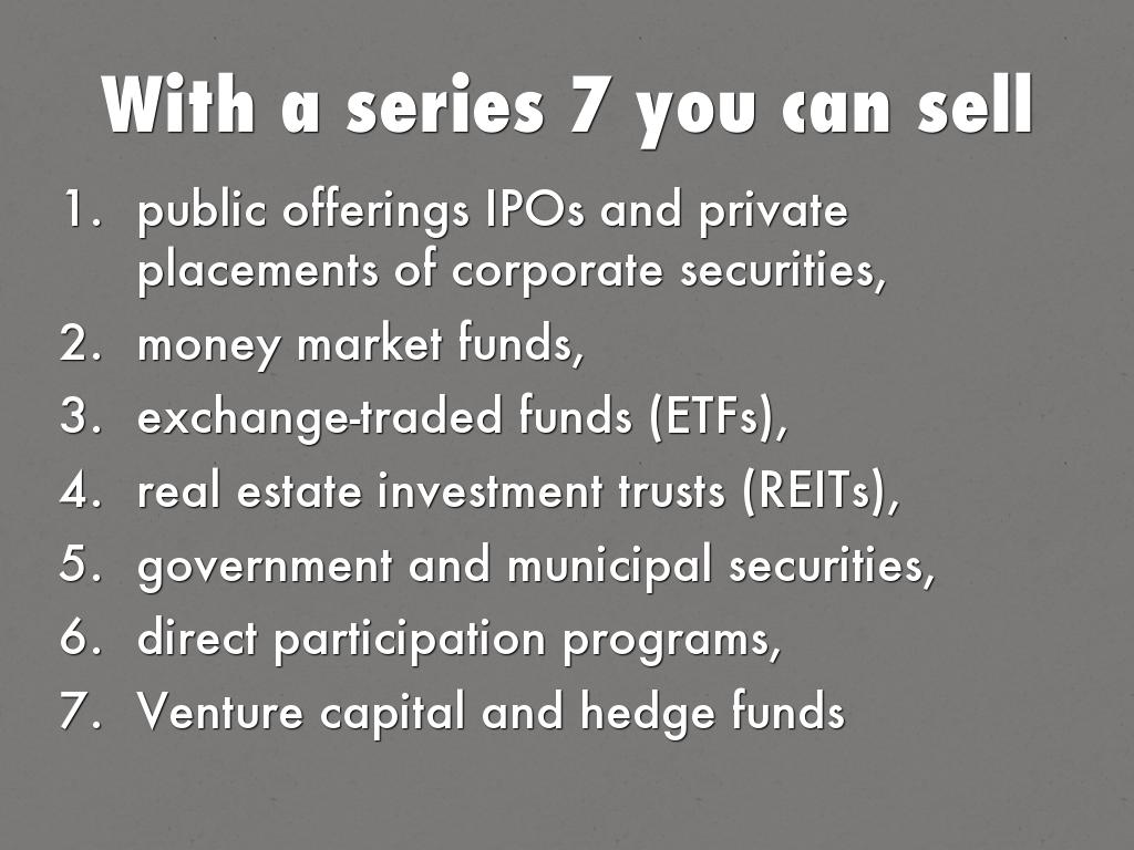 The Series 7 license is known as the general securities representative (GS) license. It authorizes licensees to sell virtually any type of individual security. This includes common and preferred stocks; call and put options; bonds and other individual fixed income investments; as well as all forms of packaged products.