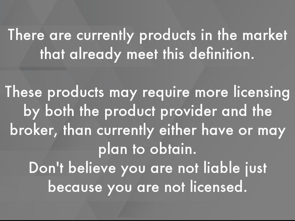 These products may require more licensing by both the product provider and the broker, than currently either have or may plan to obtain.