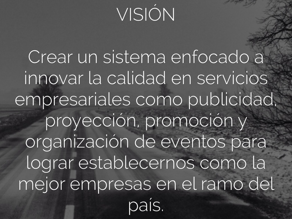 Crear un sistema enfocado a innovar la calidad en servicios empresariales como publicidad, proyección, promoción y organización de eventos para lograr establecernos como la mejor empresas en el ramo del país.