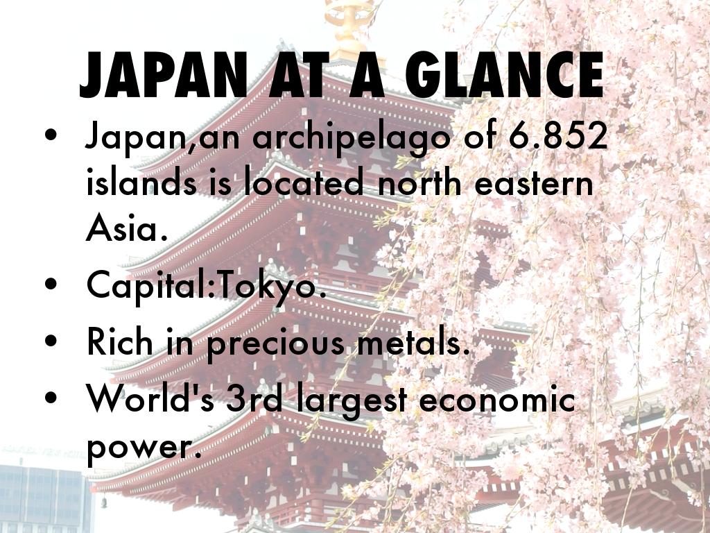 Japan,an archipelago of 6.852 islands is located north eastern Asia.