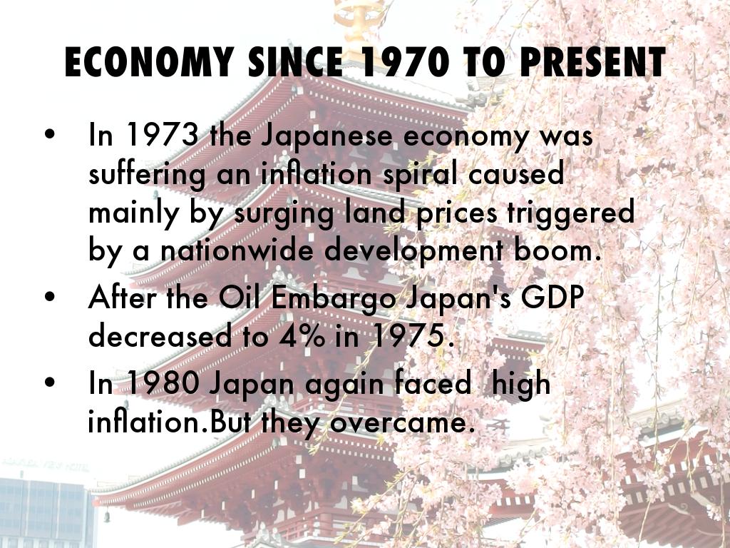 In 1973 the Japanese economy was suffering an inflation spiral caused mainly by surging land prices triggered by a nationwide development boom.