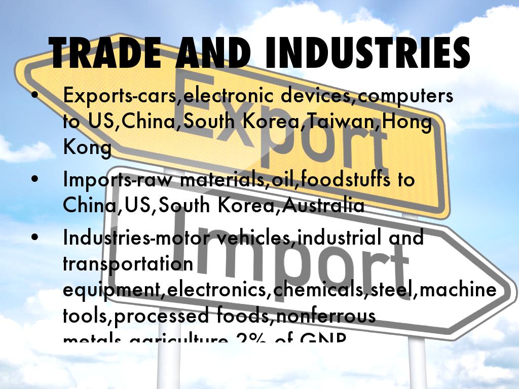 Exports-cars,electronic devices,computers to US,China,South Korea,Taiwan,Hong Kong