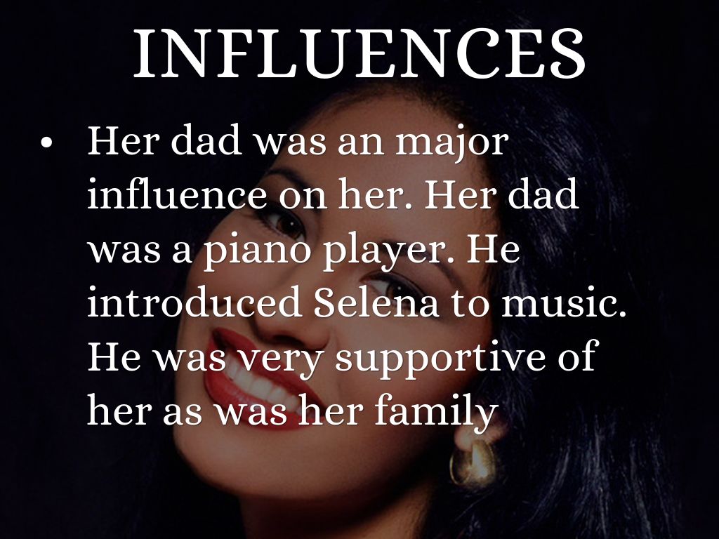 Her dad was an major influence on her. Her dad was a piano player. He introduced Selena to music. He was very supportive of her as was her family