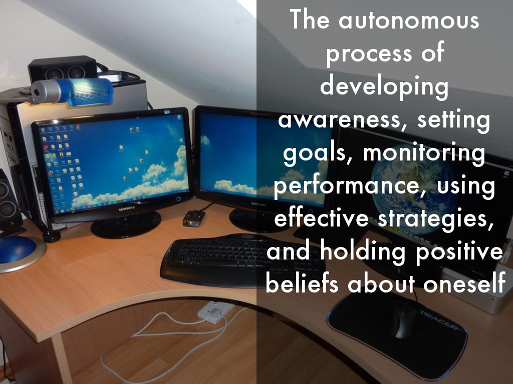 The autonomous process of developing awareness, setting goals, monitoring performance, using effective strategies, and holding positive beliefs about oneself