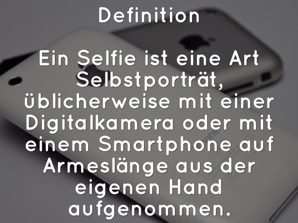 Ein Selfie ist eine Art Selbstporträt, üblicherweise mit einer Digitalkamera oder mit einem Smartphone auf Armeslänge aus der eigenen Hand