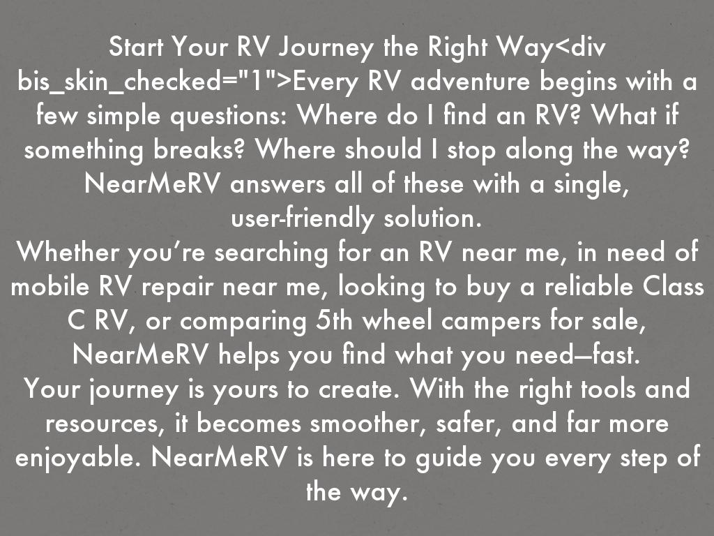 Ready to sell your RV? Nearmerv makes it simple and fast to connect with serious buyers looking for Class A motorhomes, Class C RVs, and 5th wheel campers. Create your listing in minutes and reach thousands of RV enthusiasts searching for their next adventure vehicle. Our user-friendly platform ensures your RV is seen by people near you, helping you get the best value with minimal hassle. Start your selling journey with Nearmerv today and turn your RV into cash quickly and securely! visit: https://nearmerv.com