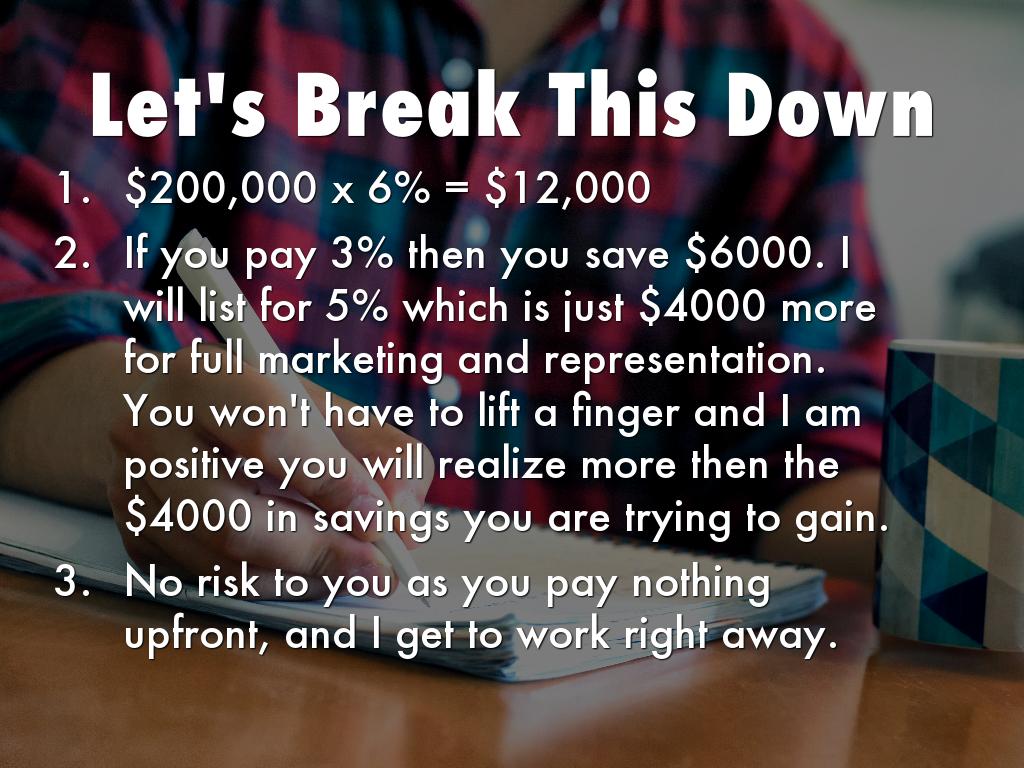 If you pay 3% then you save $6000. I will list for 5% which is just $4000 more for full marketing and representation. You won't have to lift a finger and I am positive you will realize more then the $4000 in savings you are trying to gain.