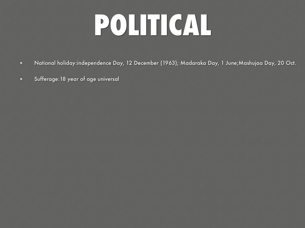 National holiday:independence Day, 12 December (1963); Madaraka Day, 1 June;Mashujaa Day, 20 Oct.
