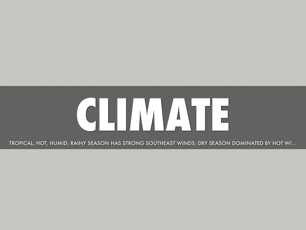 TROPICAL; HOT, HUMID; RAINY SEASON HAS STRONG SOUTHEAST WINDS; DRY SEASON DOMINATED BY HOT WIND