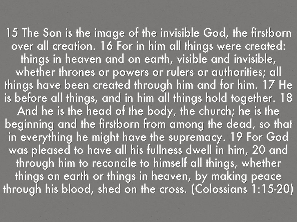 15 The Son is the image of the invisible God, the firstborn over all creation. 16 For in him all things were created: things in heaven and on earth, visible and invisible, whether thrones or powers or rulers or authorities; all things have been created through him and for him. 17 He is before all things, and in him all things hold together. 18 And he is the head of the body, the church; he is the beginning and the firstborn from among the dead, so that in everything he might have the supremacy. 19 For God was pleased to have all his fullness dwell in him, 20 and through him to reconcile to himself all things, whether things on earth or things in heaven, by making peace through his blood, shed on the cross. (Colossians 1:15-20)