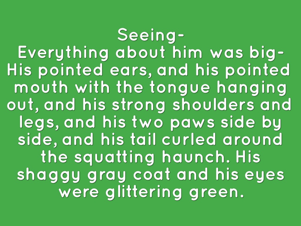 Seeing- Everything about him was big-His pointed ears, and his pointed mouth with the tongue hanging out, and his strong shoulders and legs, and his two paws side by side, and his tail curled around the squatting haunch. His shaggy gray coat and his eyes were glittering green.
