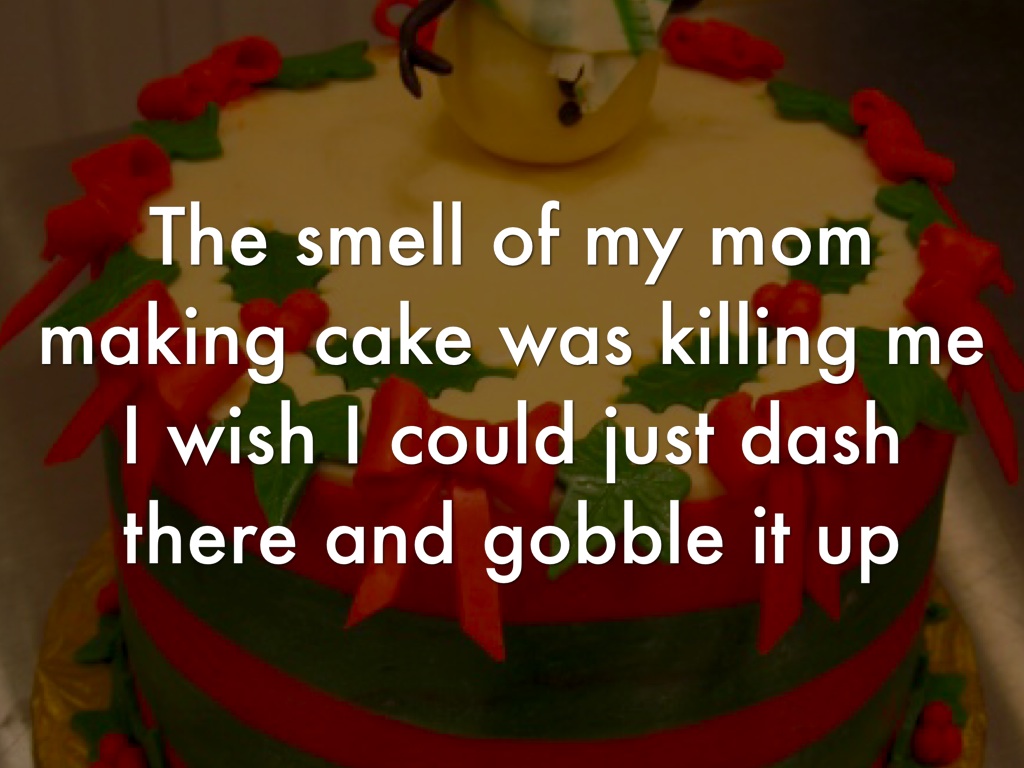 The smell of my mom making cake was killing me I wish I could just dash there and gobble it up