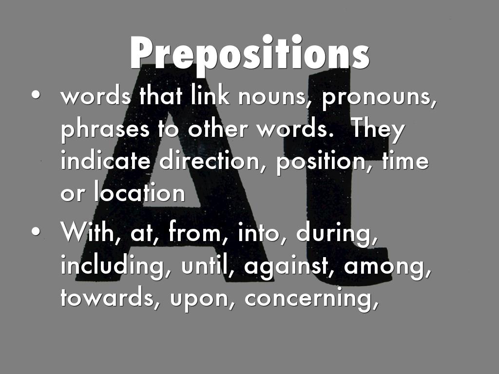 words that link nouns, pronouns, phrases to other words. They indicate direction, position, time or location
