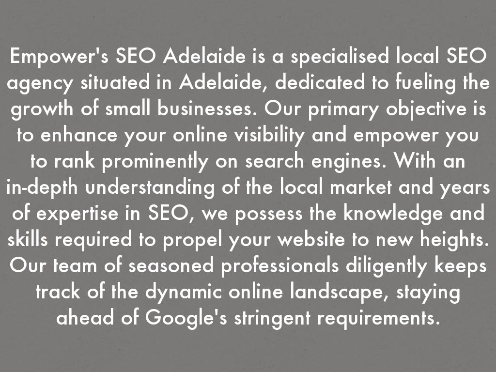 Are you a small business owner in Adelaide looking to establish a formidable online presence? Look no further than SEO Adelaide by Empower, the ultimate local SEO Company Adelaide tailored to meet your unique needs. Our unwavering focus is to assist small businesses in their growth journey by securing high rankings on search engines. We possess an unmatched understanding of the local market dynamics, enabling us to craft personalized SEO strategies that resonate with your target audience. Keeping pace with Google's ever-evolving algorithms and industry trends, our team of experts works tirelessly to implement cutting-edge techniques that deliver tangible results. By partnering with us, you gain access to a wealth of knowledge, experience, and a comprehensive approach to SEO that equips you with the best opportunity to soar above your competition and attract a steady stream of organic traffic to your website.