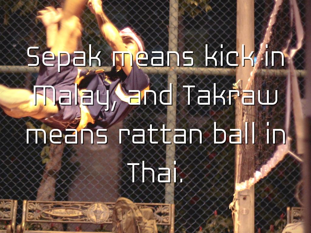 Sepak means kick in Malay, and Takraw means rattan ball in Thai.