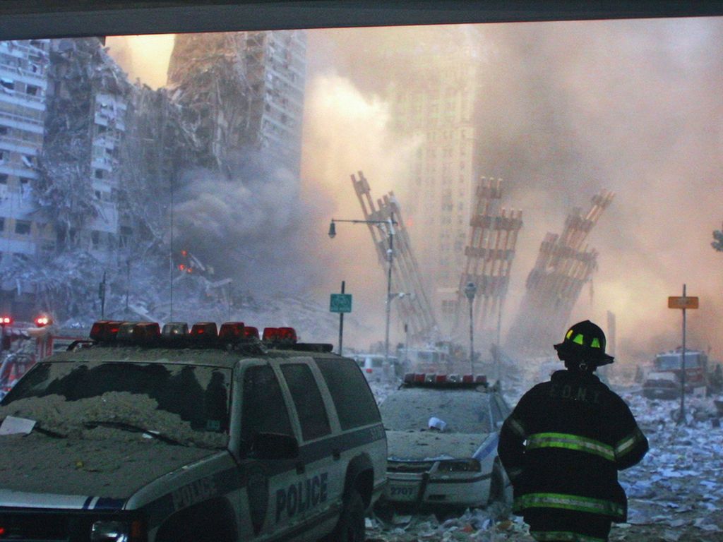 Even though the towers were hit by planes, no one in the response teams expected the towers to fall. The response teams base was actually in the lobby of the second tower to fall. After the first tower fell they fully realized the gravity of the situation. This really hit America hard. The news respondents were able to capture photos like this one, and it heightened the public's anger toward the situation.