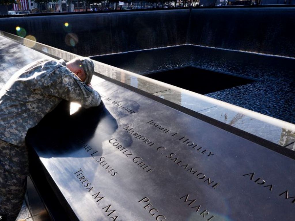 Sorrow surrounds all the memories of 9/11. So many people lost their loved ones it was incredibly devastating. Here's a picture of a soldier who found the name of a loved one at the memorial.