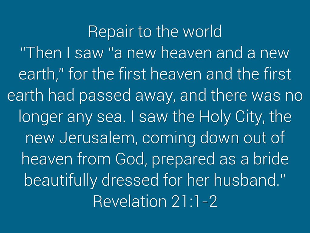 “Then I saw “a new heaven and a new earth,” for the first heaven and the first earth had passed away, and there was no longer any sea. I saw the Holy City, the new Jerusalem, coming down out of heaven from God, prepared as a bride beautifully dressed for her husband.”