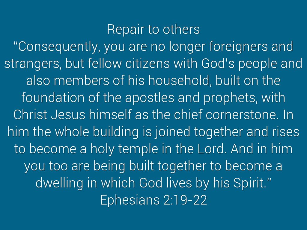 “Consequently, you are no longer foreigners and strangers, but fellow citizens with God’s people and also members of his household, built on the foundation of the apostles and prophets, with Christ Jesus himself as the chief cornerstone. In him the whole building is joined together and rises to become a holy temple in the Lord. And in him you too are being built together to become a dwelling in which God lives by his Spirit.”