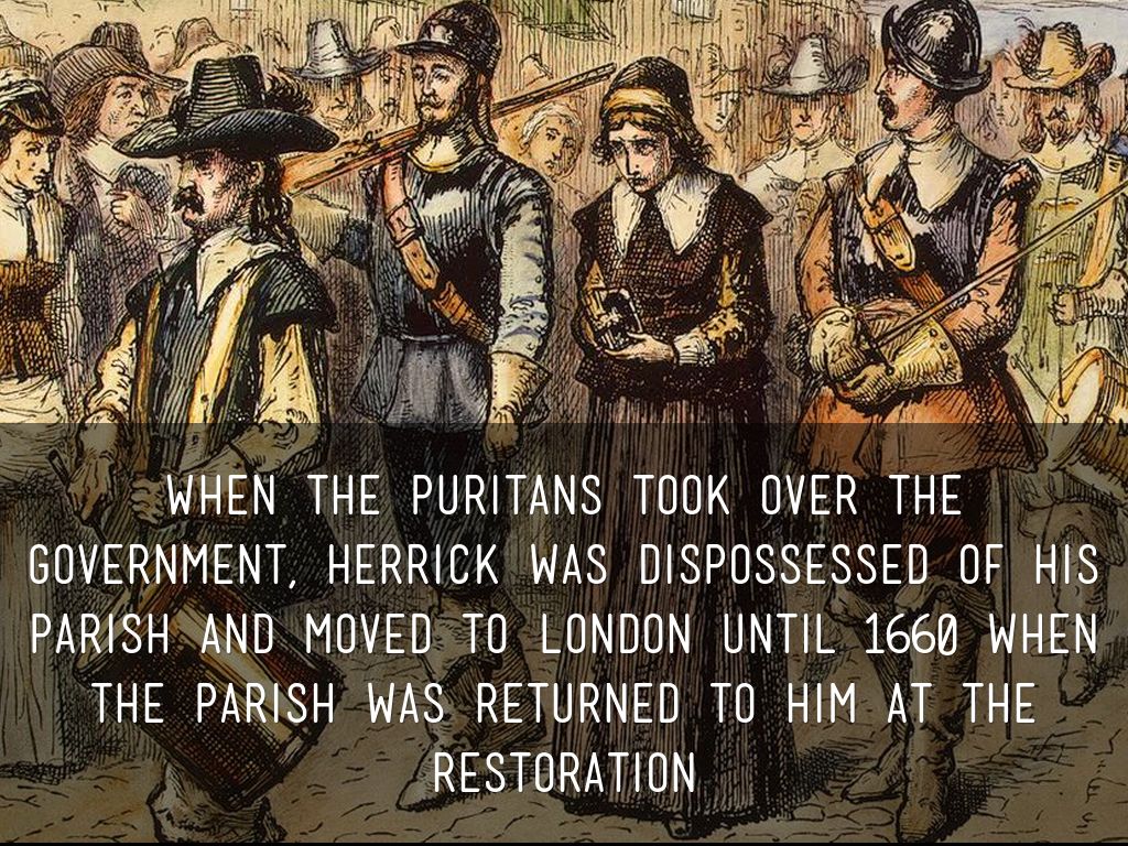 When the Puritans took over the government, Herrick was dispossessed of his parish and moved to London until 1660 when the parish was returned to him at the Restoration