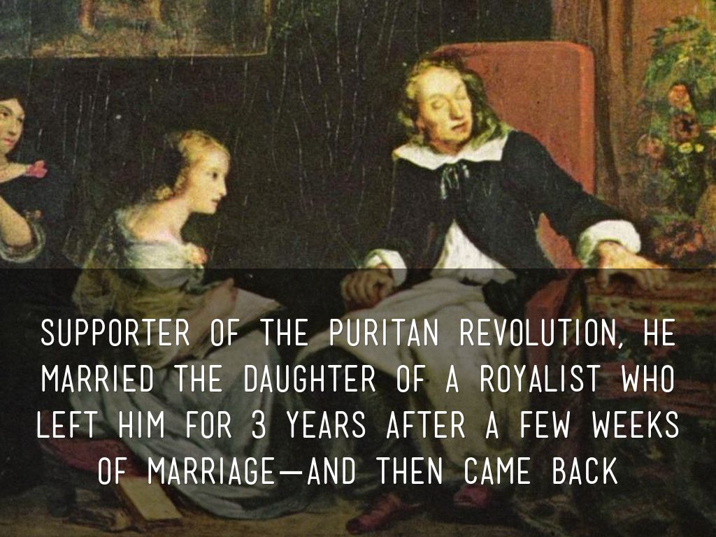supporter of the Puritan revolution, he married the daughter of a Royalist who left him for 3 years after a few weeks of marriage−and then came back
