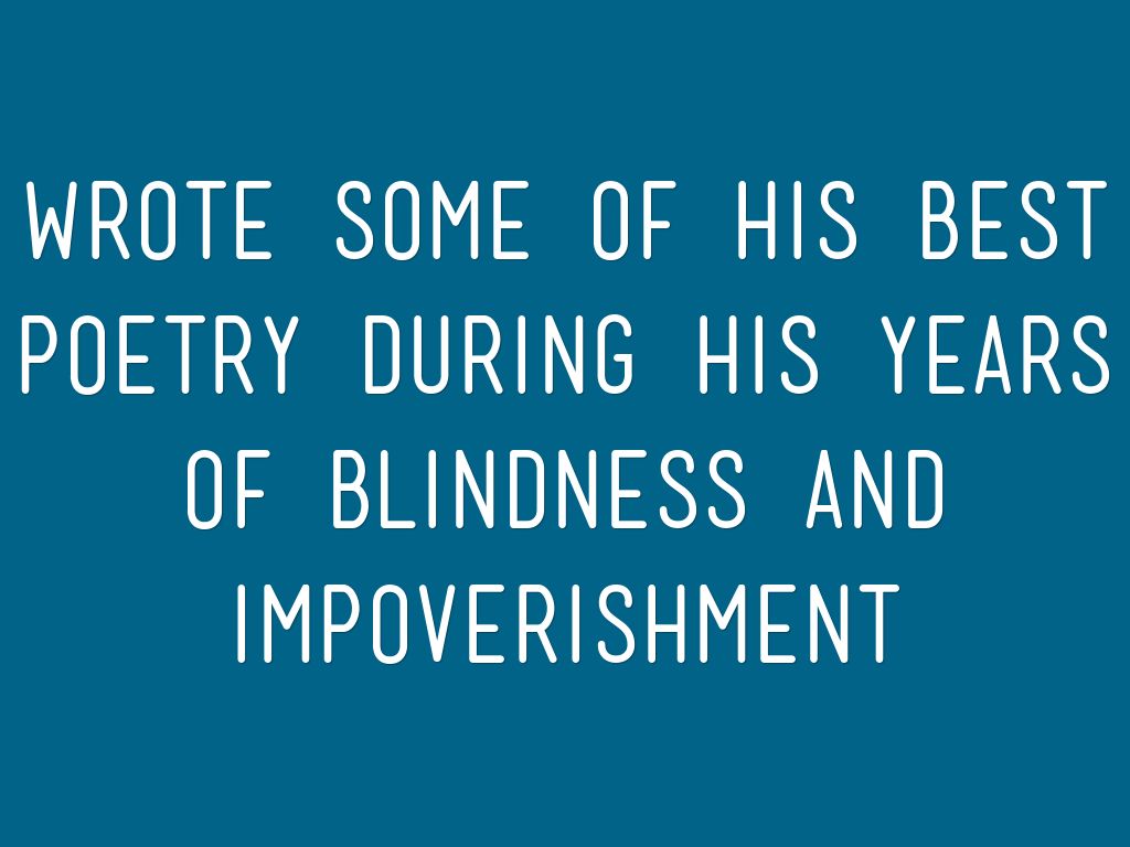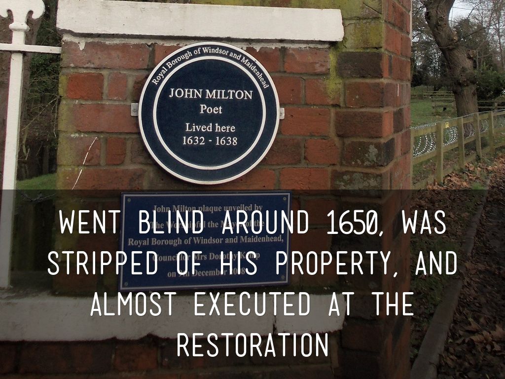 went blind around 1650, was stripped of his property, and almost executed at the Restoration