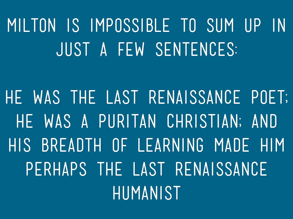 he was the last Renaissance poet; he was a Puritan Christian; and his breadth of learning made him perhaps the last Renaissance humanist