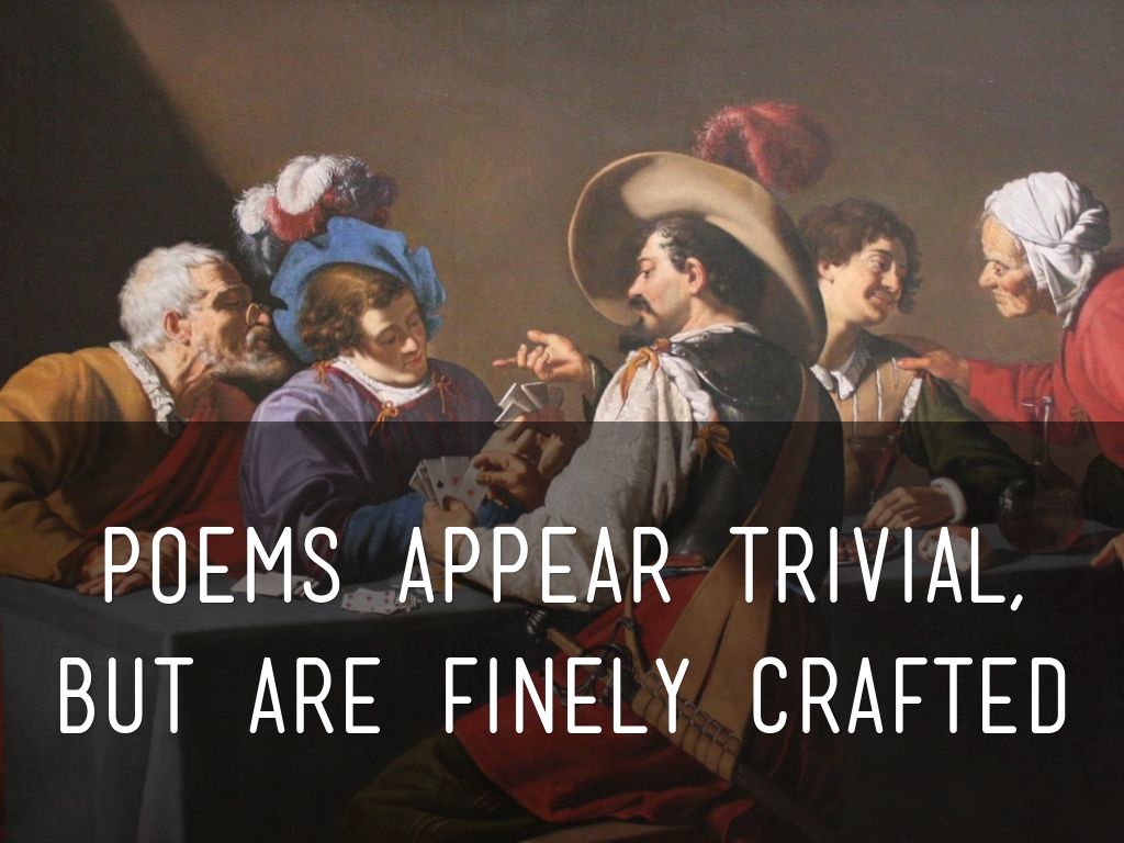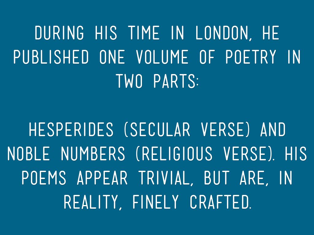 Hesperides (secular verse) and Noble Numbers (religious verse). His poems appear trivial, but are, in reality, finely crafted.