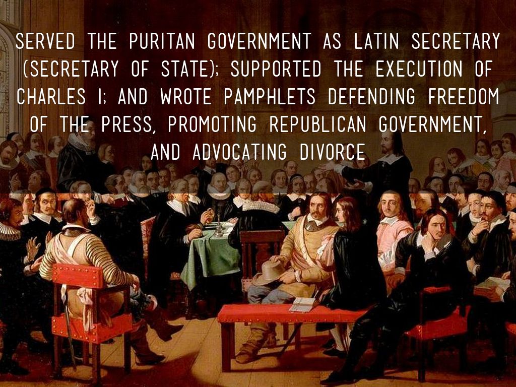 served the Puritan government as Latin Secretary (Secretary of State); supported the execution of Charles I; and wrote pamphlets defending freedom of the press, promoting republican government, and advocating divorce