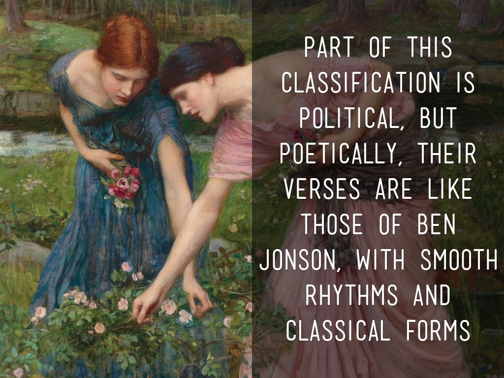 Part of this classification is political, but poetically, their verses are like those of Ben Jonson, with smooth rhythms and classical forms
