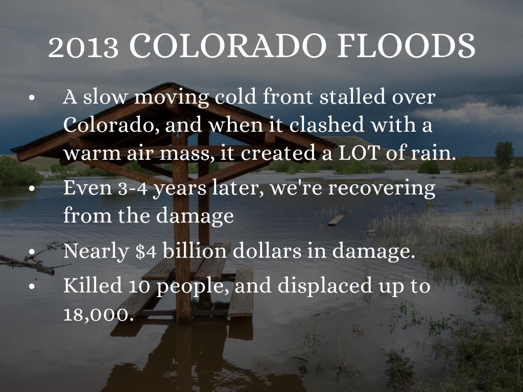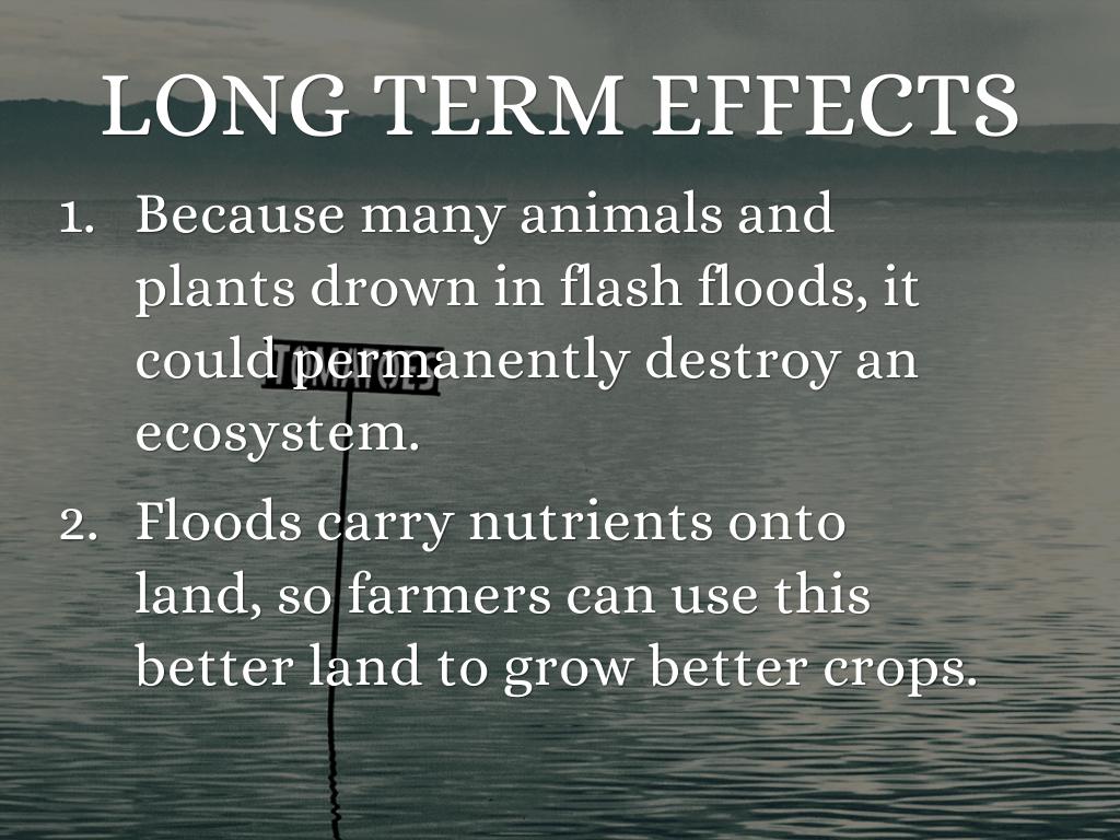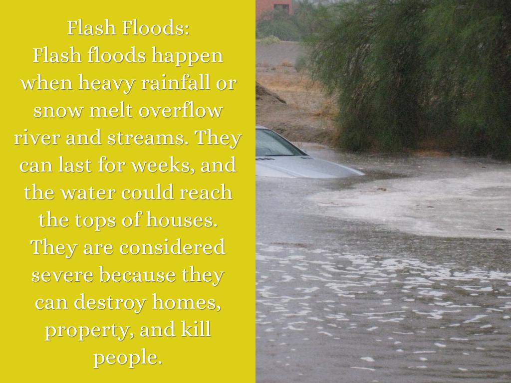 Flash Floods: Flash floods happen when heavy rainfall or snow melt overflow river and streams. They can last for weeks, and the water could reach the tops of houses. They are considered severe because they can destroy homes, property, and kill people.