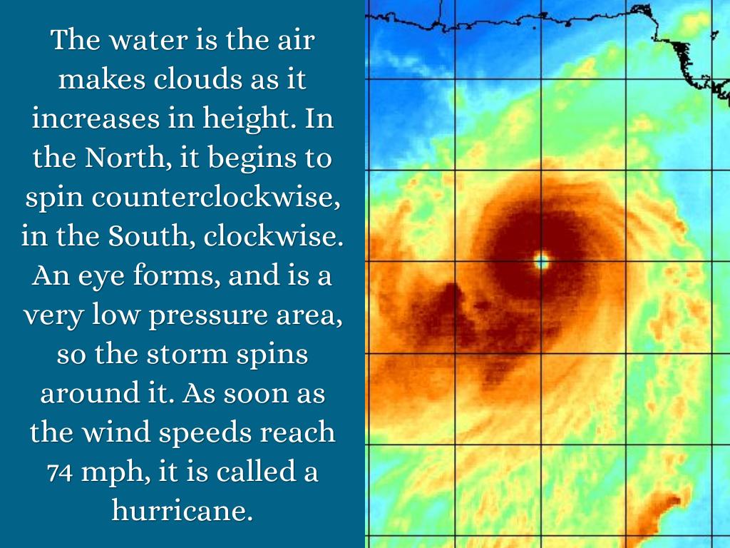 The water is the air makes clouds as it increases in height. In the North, it begins to spin counterclockwise, in the South, clockwise. An eye forms, and is a very low pressure area, so the storm spins around it. As soon as the wind speeds reach 74 mph, it is called a hurricane.