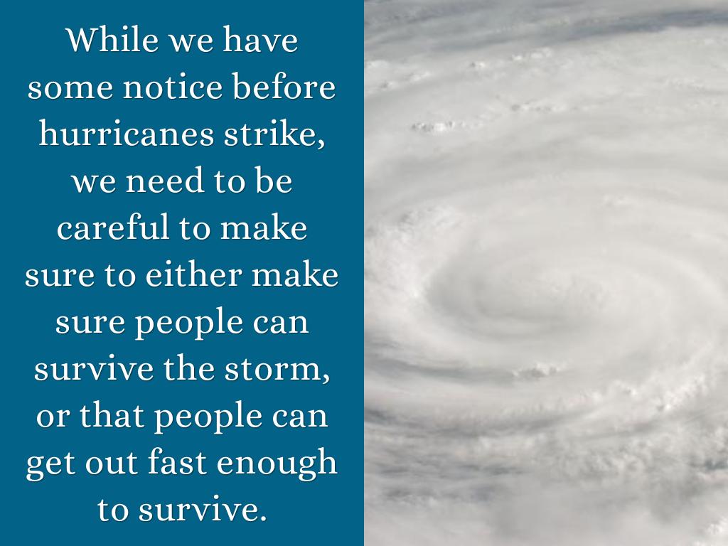 While we have some notice before hurricanes strike, we need to be careful to make sure to either make sure people can survive the storm, or that people can get out fast enough to survive.