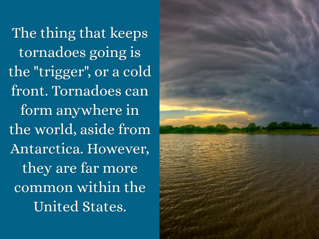 The thing that keeps tornadoes going is the "trigger", or a cold front. Tornadoes can form anywhere in the world, aside from Antarctica. However, they are far more common within the United States.