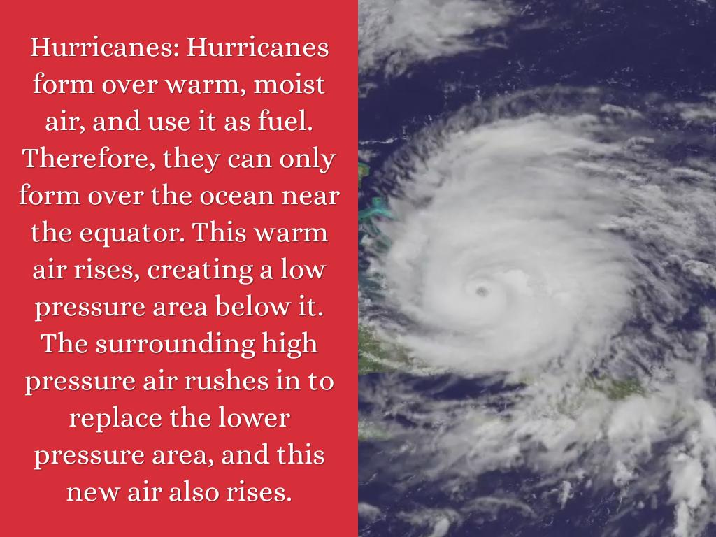 Hurricanes: Hurricanes form over warm, moist air, and use it as fuel. Therefore, they can only form over the ocean near the equator. This warm air rises, creating a low pressure area below it. The surrounding high pressure air rushes in to replace the lower pressure area, and this new air also rises.