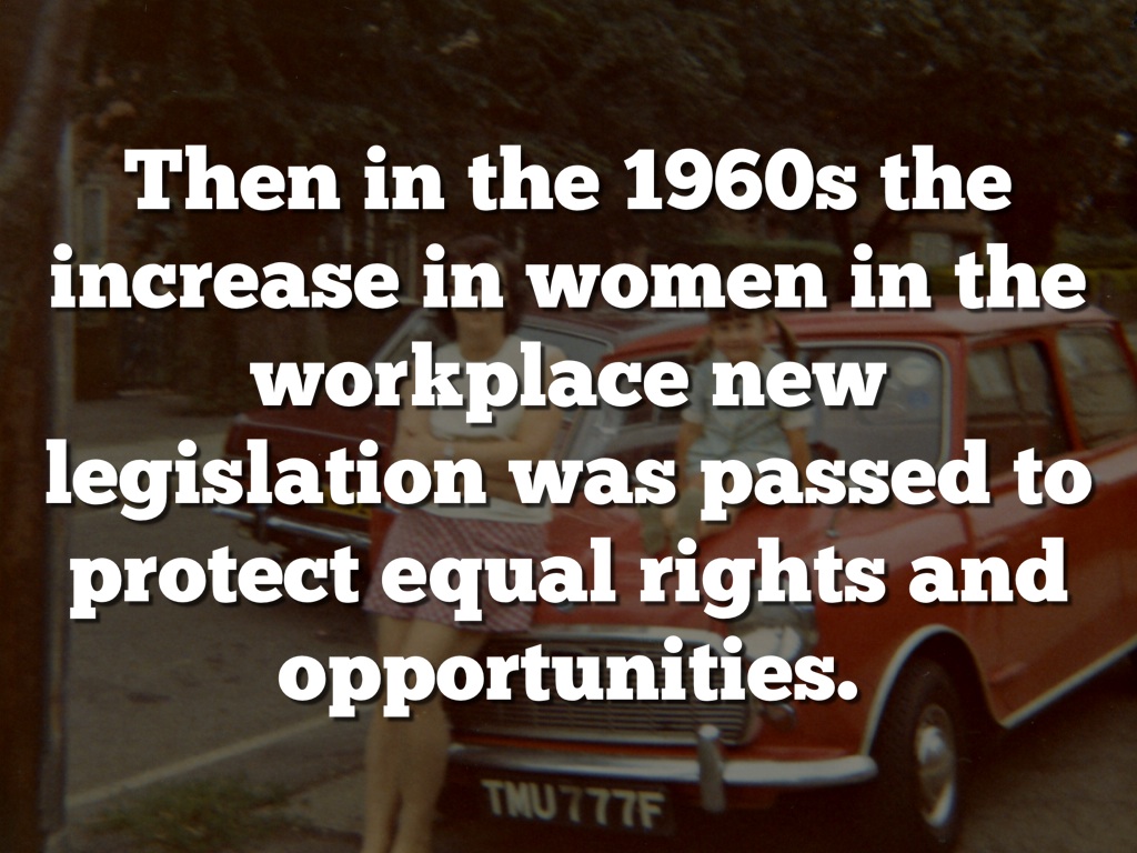 Then in the 1960s the increase in women in the workplace new legislation was passed to protect equal rights and opportunities.